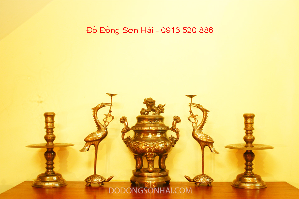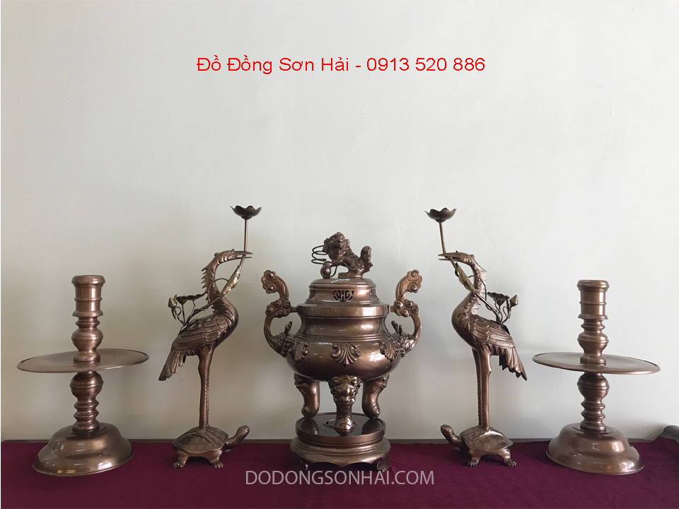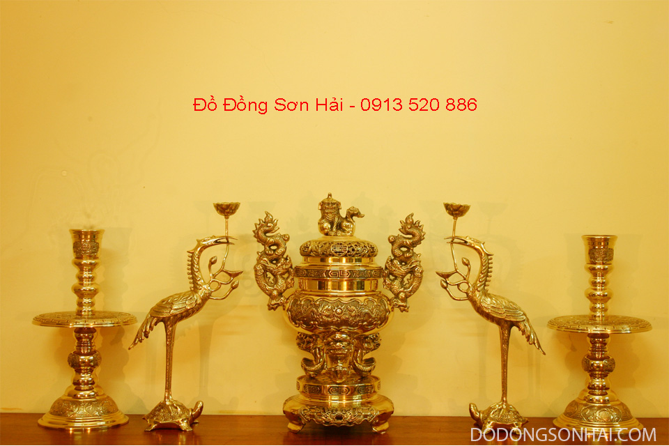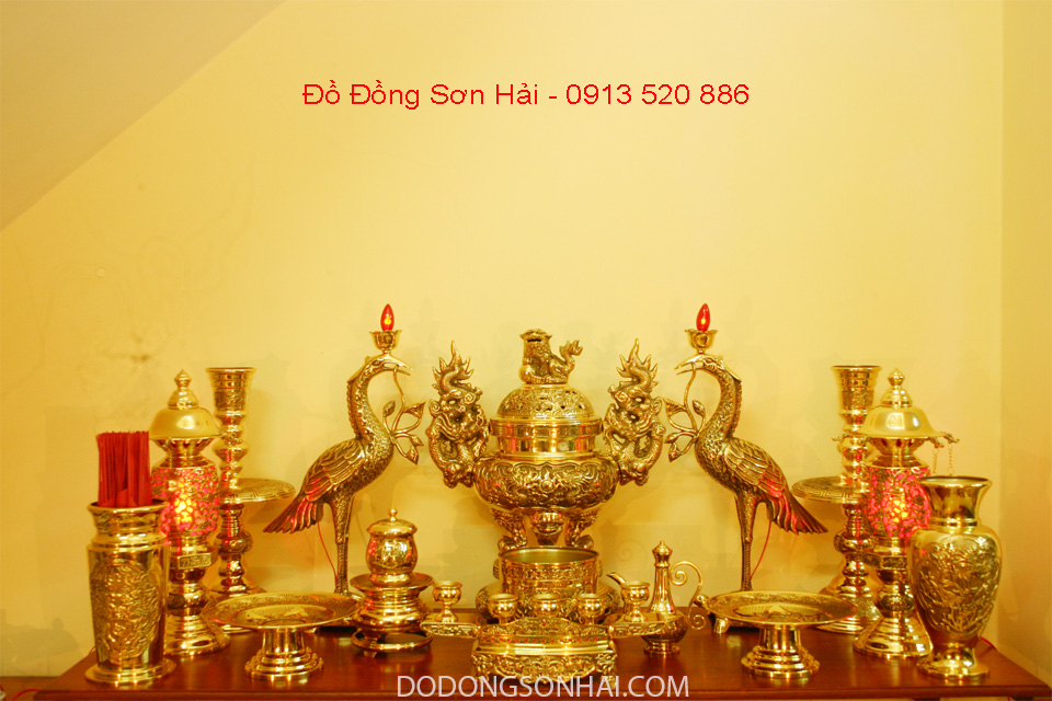 Đồ Thờ Sơn Hải giới thiệu bộ đồ thờ bằng đồng Đài Loan trên bàn thờ gia tiên, gồm: 1 đỉnh đồng cao 56cm, mã B269A; 2 chân nến đồng cao 47cm mã H850B; 2 con hạc đồng có đèn điện cao 54cm, mã H854A; 1 bát hương đồng An lư đại cát rộng 18,5 cm, cao 18,5 cm, mã A146; 2 mâm bồng bằng đồng Phú quý rộng 29cm, mã D457; 1 lọ hoa bằng đồng Phượng hoàng cao 30cm, mã E515; 1 ống đựng hương (nhang) bằng đồng Hợp gia bình an cao 27 cm, mã D424; 1 bộ chén thờ khay bằng đồng rộng 25 cm, mã F637, 5 ly mặt trơn, mã 1014; 1 nậm rượu bằng đồng Tài vượng cao 17cm, mã D438; 1 bộ đài nước thờ có đế cao 23 cm, mã D472A; 2 đèn thờ bằng đồng cắm điện cao 48 cm, mã G712A.