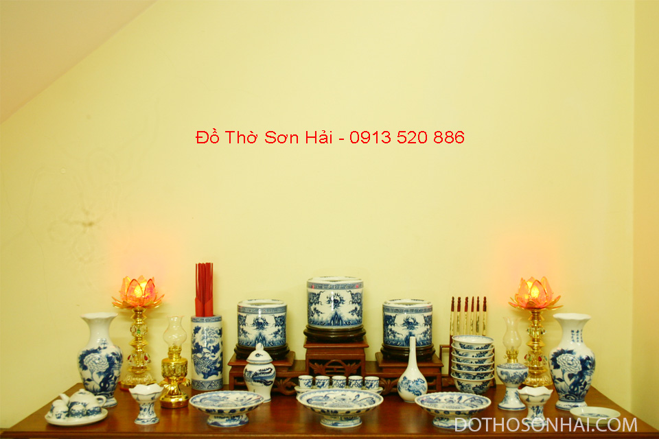 Bộ đồ thờ bằng sứ Bát Tràng cao cấp, men lam giả cổ, gồm: 1 bát hương cao cấp miệng cong rộng 18cm; 2 bát hương cao cấp miệng cong rộng 16cm; 1 tam sơn để bát hương bằng gỗ hương rộng 20cm;1 đế bát hương gỗ tròn rộng 17cm; 2 đế bát hương gỗ tròn rộng 15cm; 1 bộ chén thờ khay 5 ly to; 1 nậm rượu nhỡ; 1 chóe thờ nhỡ; 1 mâm bồng sứ rộng 20cm; 2 mâm bồng bằng sứ rộng 18cm; 2 chân nến nhỡ; 1 ống hương nhỡ; 2 lọ hoa sứ Lan cao 30cm; bộ 6 bát + đũa thờ giả cổ; 1 đèn dầu thờ Aladin nhỏ; 1 bộ ấm chén trà thờ 4 chén.