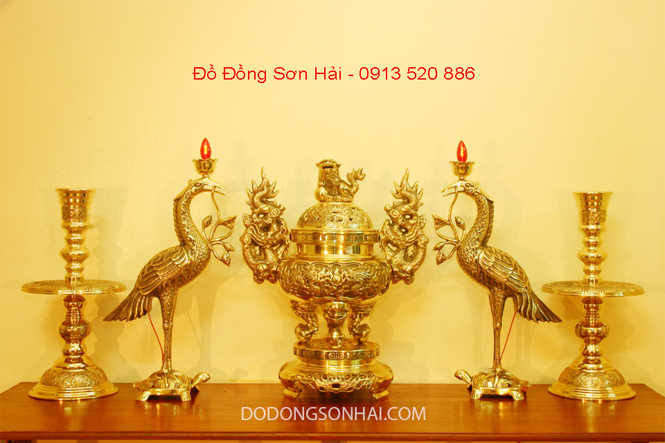 Đồ thờ cúng bằng đồng, bộ ngũ sự bằng đồng Đài Loan mã B269A, gồm: 1 đỉnh đồng cao 56cm; 2 chân nến đồng cao 47cm mã H850B; 2 hạc thờ bằng đồng có đèn điện cao 54cm, mã H854A; phù hợp với bàn thờ dài 1m76 đến 2m23.