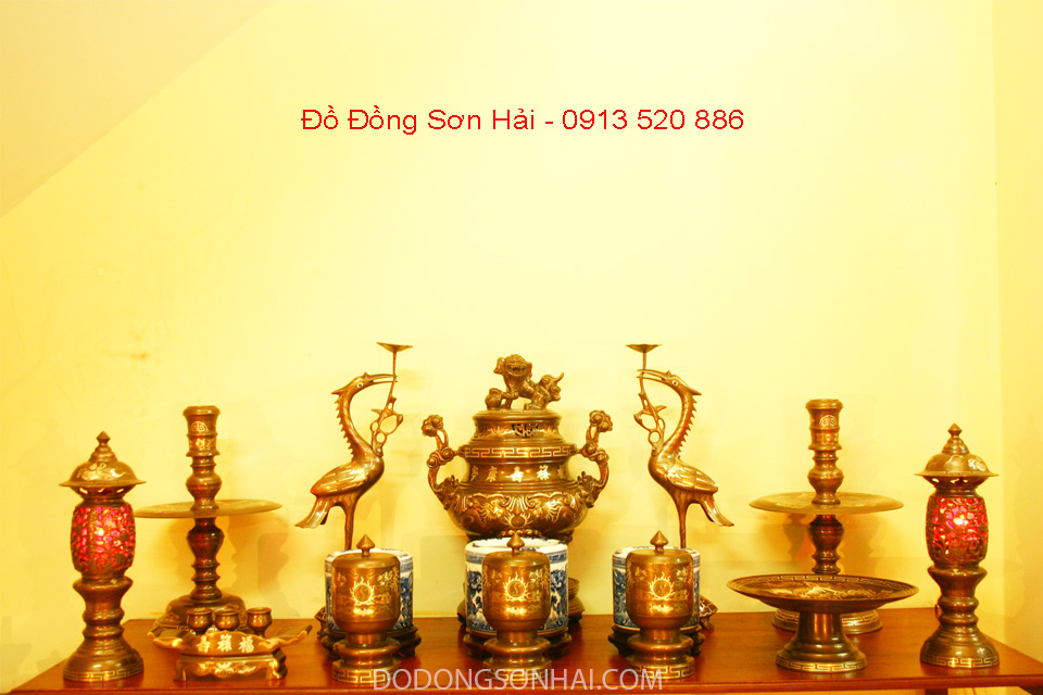 Đồ Đồng Sơn Hải đúc Đồ Thờ Cúng Bằng Đồng vàng, đồng đỏ, khảm tam khí, ngũ sắc, đồng hun giả cổ cao cấp theo mẫu cổ truyền Việt Nam, thờ Gia tiên, thờ Phật trang trọng.