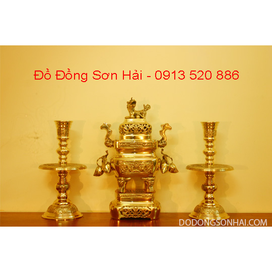 Bộ lư đồng tam sự, gồm: 1 đỉnh đồng cao 57cm, mã LV02, 2 chân đèn đồng cao 54cm, mã CD03; phù hợp với bàn thờ dài 1m76 đến 2m23.