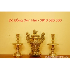 Bộ tam sự bằng đồng mã LTV3, gồm: 1 đỉnh đồng cao 48cm,  2 chân đèn bằng đồng cao 40cm mã CDV3; phù hợp với bàn thờ dài  1m54 đến 1m76.