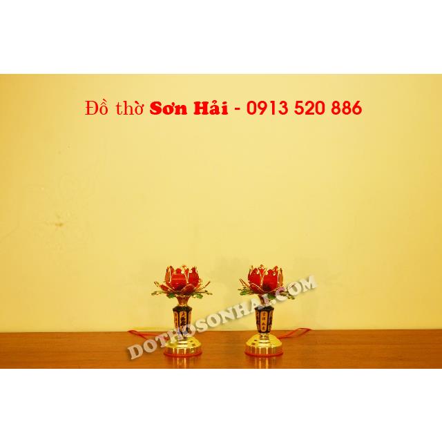 Đèn bàn thờ Phật cao 20cm, thân đèn dáng trụ cách điệu với 1 bông Sen đang nở, họa tiết đẹp, đèn cắm điện ánh sáng đỏ tạo nên sự ấm cúng, trang trọng nơi thờ tự.